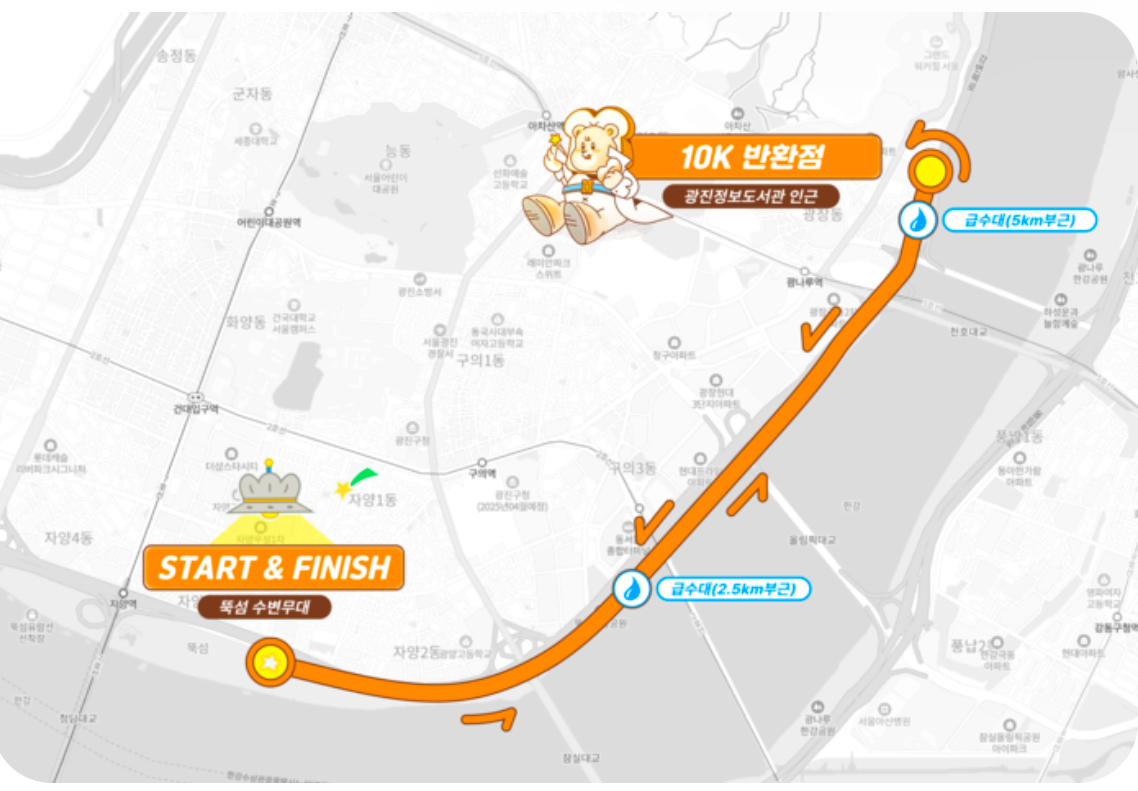 10km코스 : 행사장 → 잠실대교 → 잠실철교 → 올림픽대교 → 천호대교 → 광진정보도서관(반환)
